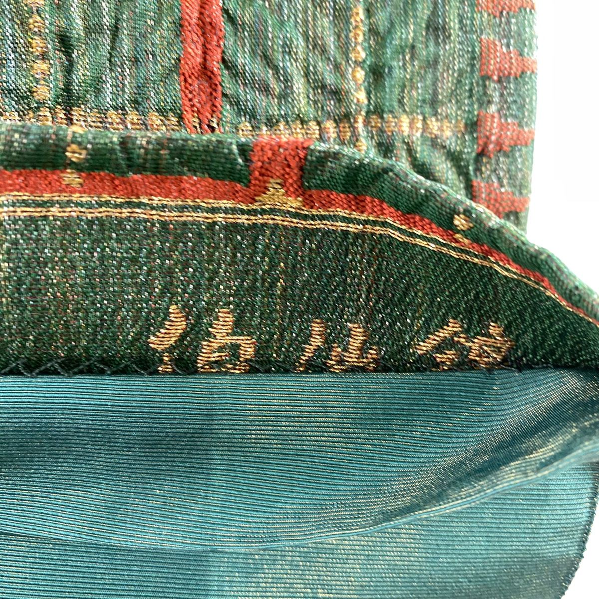 袋帯 名品 じゅらく 落款 格子 箔 銀糸 緑 六通 正絹