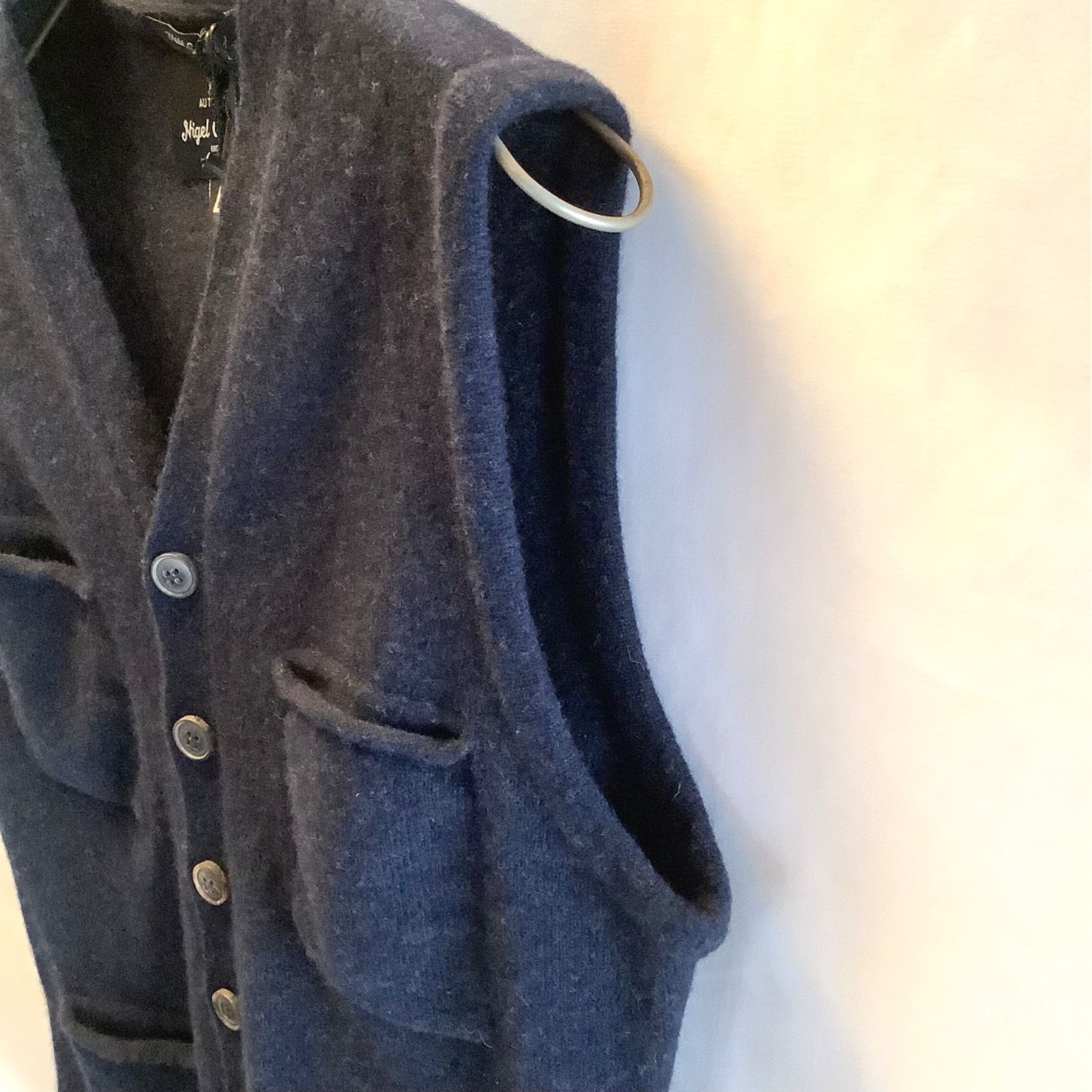 英国を初めヨーロッパの生地を使用し、伝統ある英国のファクトリーを中心に生産する最強の製品 AUTHENTIC LINE(オーセンティックライン)2015AW コレクション(KNITWEAR)の毛 100%(5 GAUGE LAMBSWOOL)で仕立てられた前身頃に4ポケットと6ボタン式のノーカラーベストとなります。