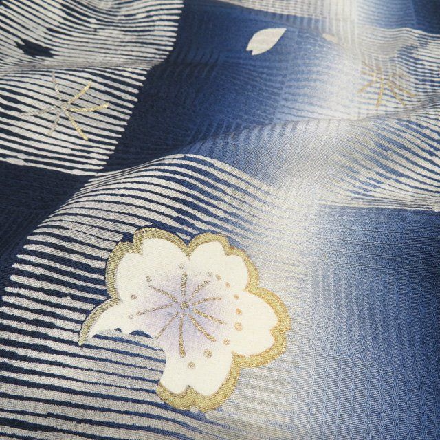 小紋 着物 正絹 袷 カジュアル 長格子模様 桜模様 濃紺色 多色 金 身丈159.5 cm 裄70 M きもの北條 A 1282-14