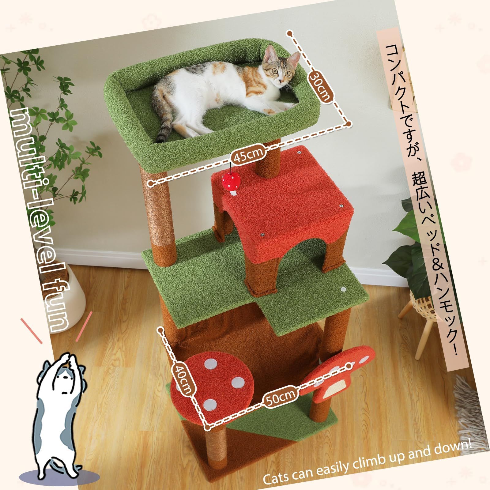 省スペース 登りやすい ハンモック キノコ 見晴台 多頭飼い ねこハウス ボンボン 据え置き 天然麻紐 猫タワー 爪とぎ 運動不足解消 大型猫用 かわいい スリム 組み立て簡単 - キャットタワー ブラウン ぺテぺラ 高さ143 cm