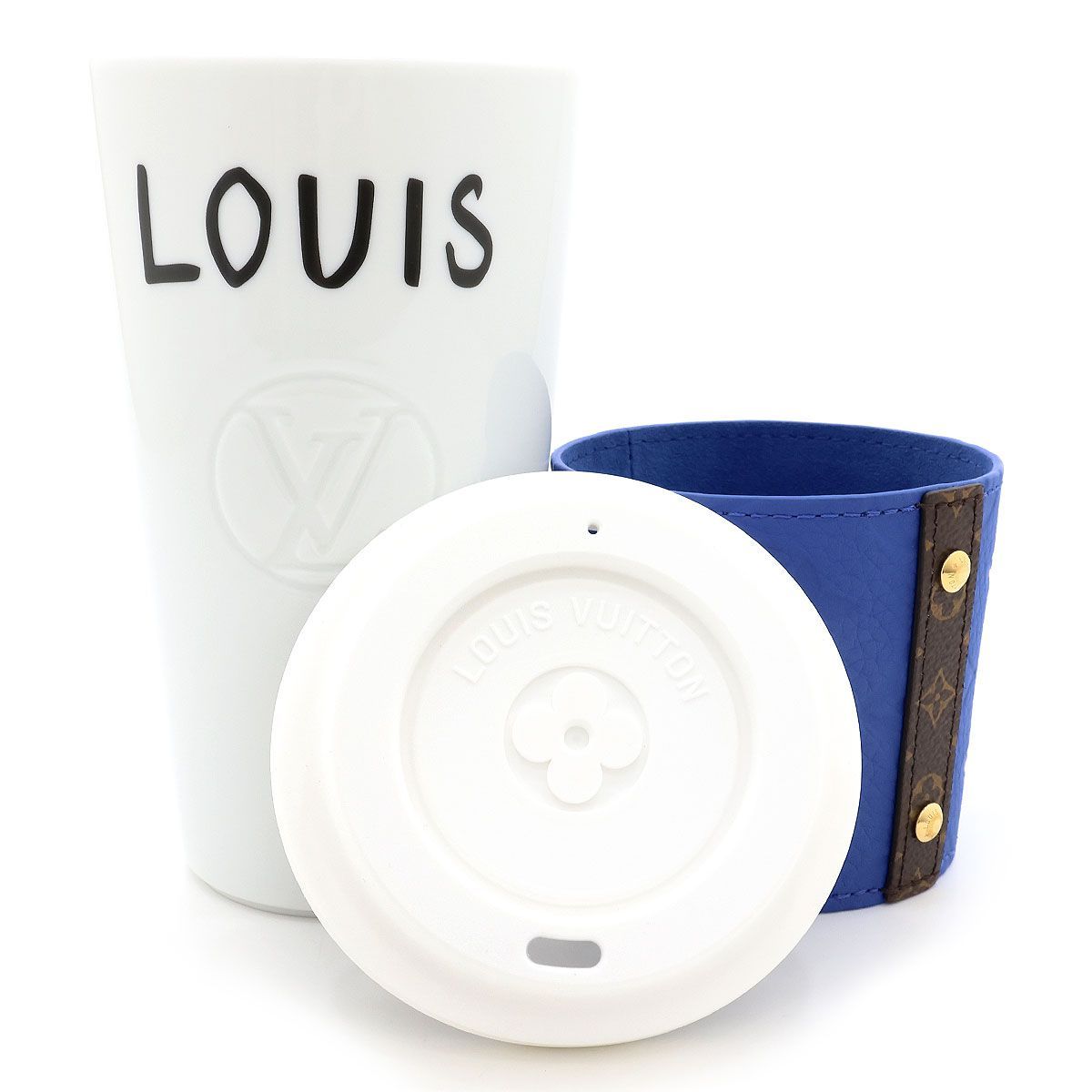 ルイヴィトン LOUISVUITTON GI1106 カップルイ タンブラー 磁器 トリヨンレザー モノグラム スリーブ付き ホワイト ブルー シリコン蓋付き ほぼ未使用 ルイヴィトンカップ コーヒー カップ ブランド食器 ご褒美 おしゃれ インテリア LV レディース メンズ ユニセックス 男女兼用