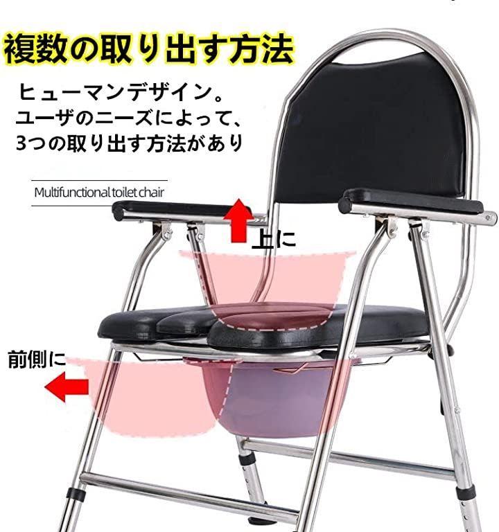 *サイズ:(幅)53x(奥行)52x(高さ)89~98cm*座面サイズ:41x43cm*蓋付き便器サイズ:33x28x16cm*材質:ステンレス鋼+レザー*商品重量:約5.2KG*座部耐荷重:150kg*折りたたみ式*付属品::トイレブラシ、ゴミ袋