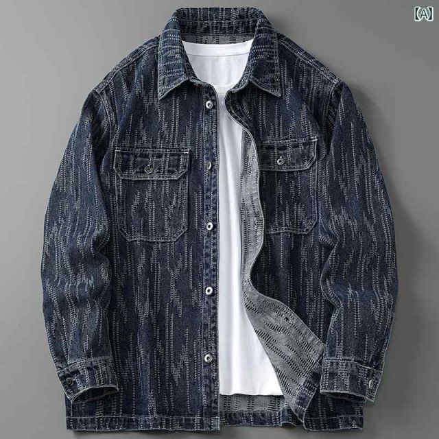 3 XL 秋冬 コーデ メンズ 服 シンプル ファッション オシャレ 大人 かっこいい 大きいサイズ ストリート 紳士服 アメリカン ジャガード デニム シャツ レトロ 長袖 ジャケット