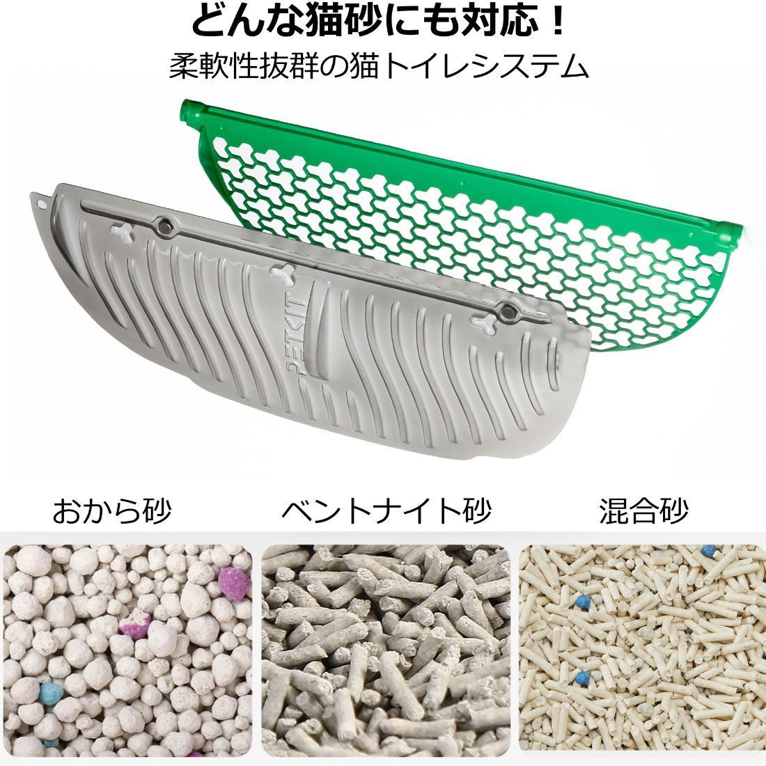 おから砂・ベントナイト砂・混合砂などの特殊形状のトレイで様々なネコ砂に対応しています。