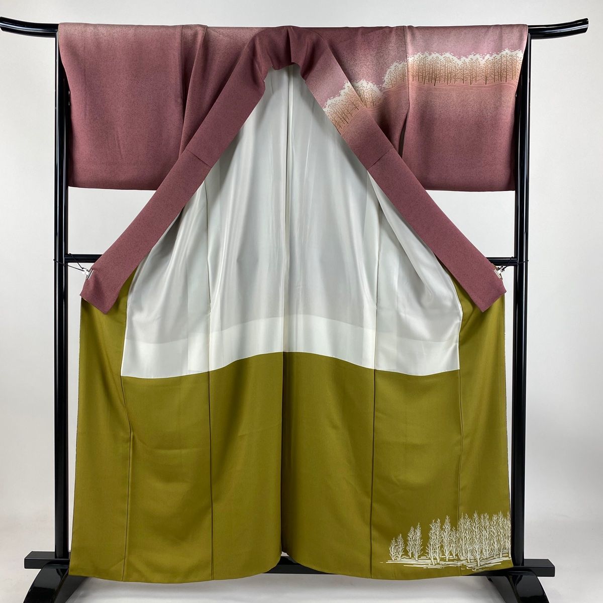 訪問着 身丈161 cm 裄丈67 M 袷 落款 樹木 霞 染め分け ぼかし 赤紫 正絹 秀品