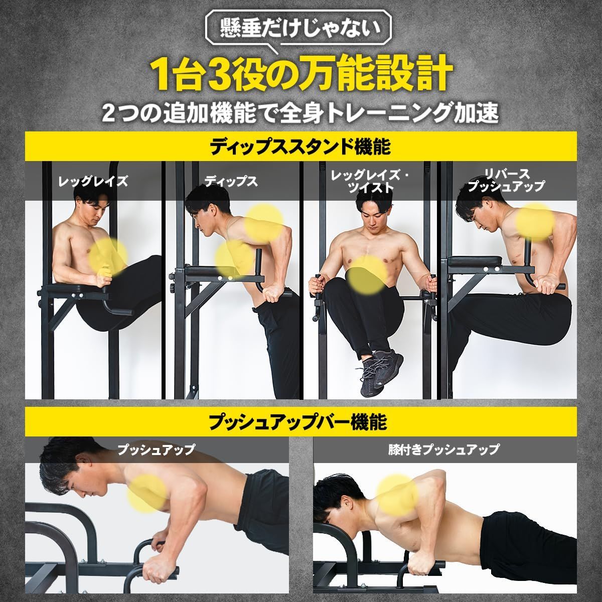 【耐荷重最大150kgの頑強設計】安定性を追求し、土台のパイプ数を従来のチンニングスタンドよりも増やした懸垂マシン・ぶら下がり健康器です。面で地面に接する脚カバーを採用し、安心して筋トレで背筋を鍛えることができる耐荷重最大150kgの安定性を誇る懸垂マシンに仕上げました。懸垂バーやディップスバーなど、複数筋トレグッズの機能をこのマルチ懸垂マシン1つで。