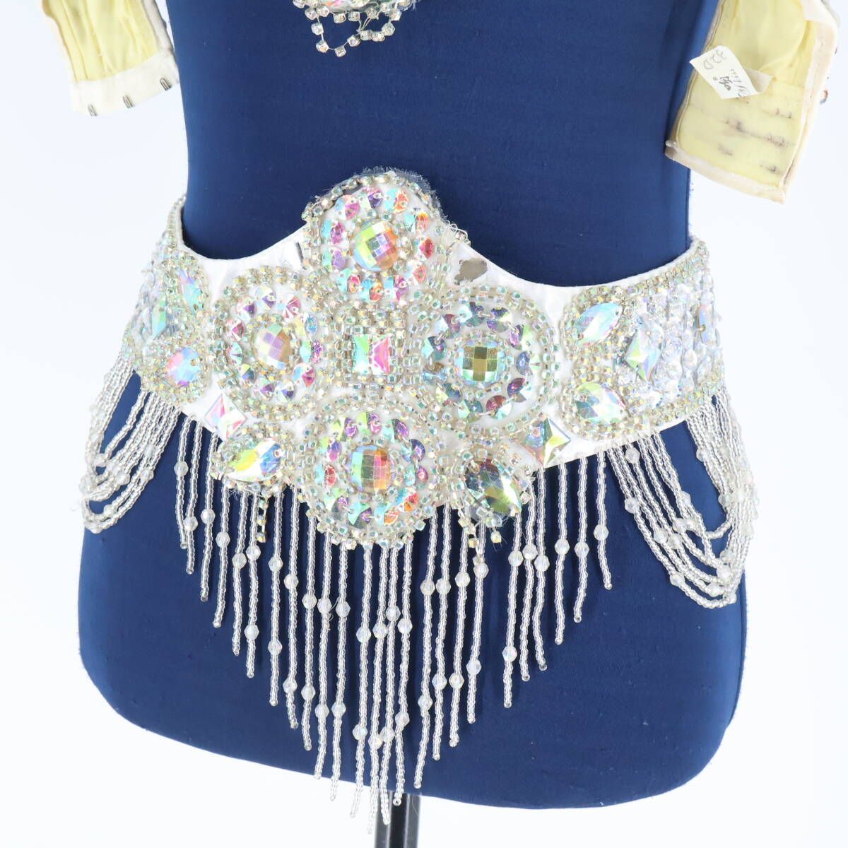 ベリーダンス用 オリエンタル衣装 ホワイト×シルバー ラインストーン 白 ラメ 2点セット 煌びやか Sサイズ 輝き トップス ベルト セット 豪華 ダンス衣装 ステージ衣装 発表会衣装 シルバーアクセント 豪華デザイン エレガント