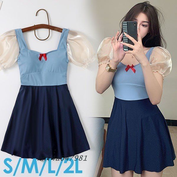 ワンピース水着 レディース プリンセス風 かわいい パフスリーブ リボン 水着 着〓せ 撮影 温泉 プール ビーチ ブルー S M L 2L T2M3