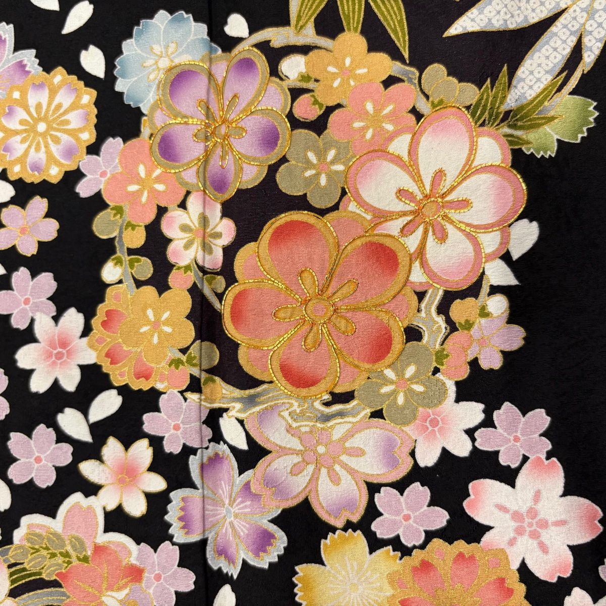 振袖 身丈156.5 cm 裄丈65.5 M 袷 花丸文 桜 金糸 金彩 黒 正絹