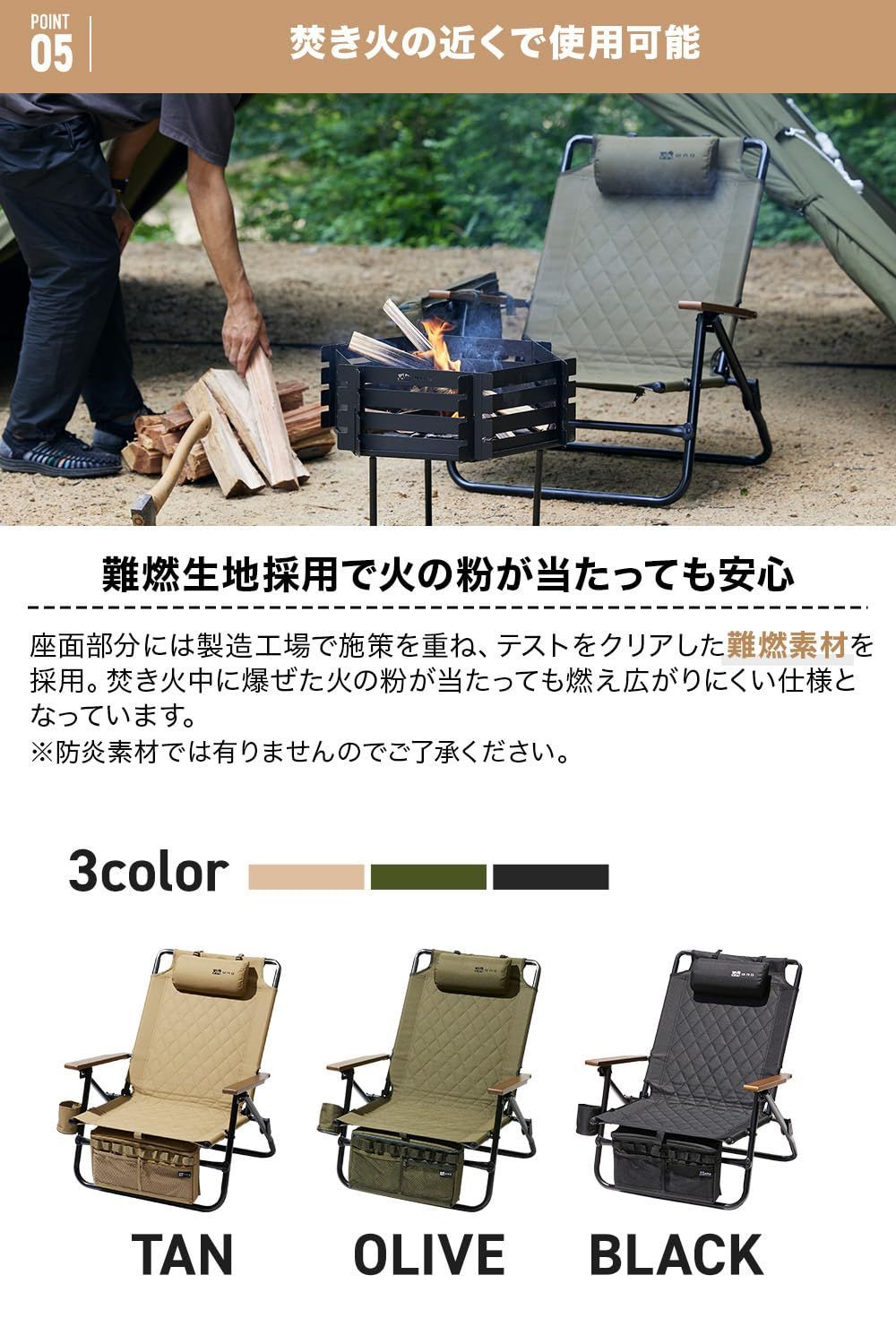 【焚き火の近くで使用可能】座面部分には厚手のシートを使用しているため火の粉があたっても燃え広がりにくい仕様となっています。リラックスタイムの焚火チェアとしても最適です。