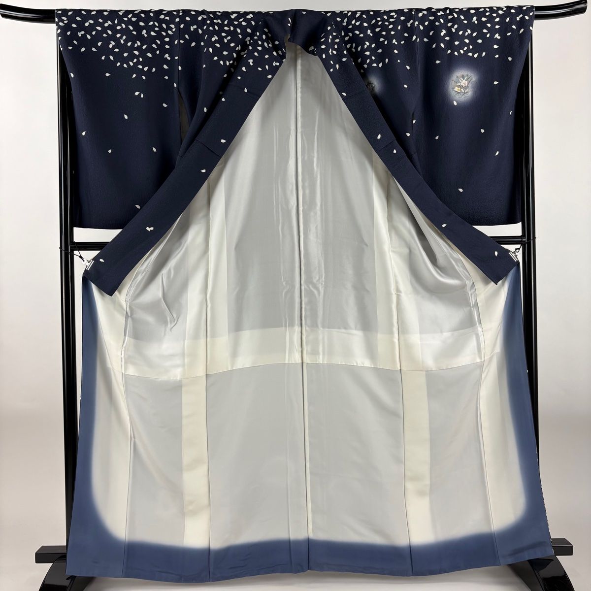訪問着 身丈165.5 cm 裄丈66.5 M 袷 雪輪 桜 ぼかし 金銀彩 紺色 正絹