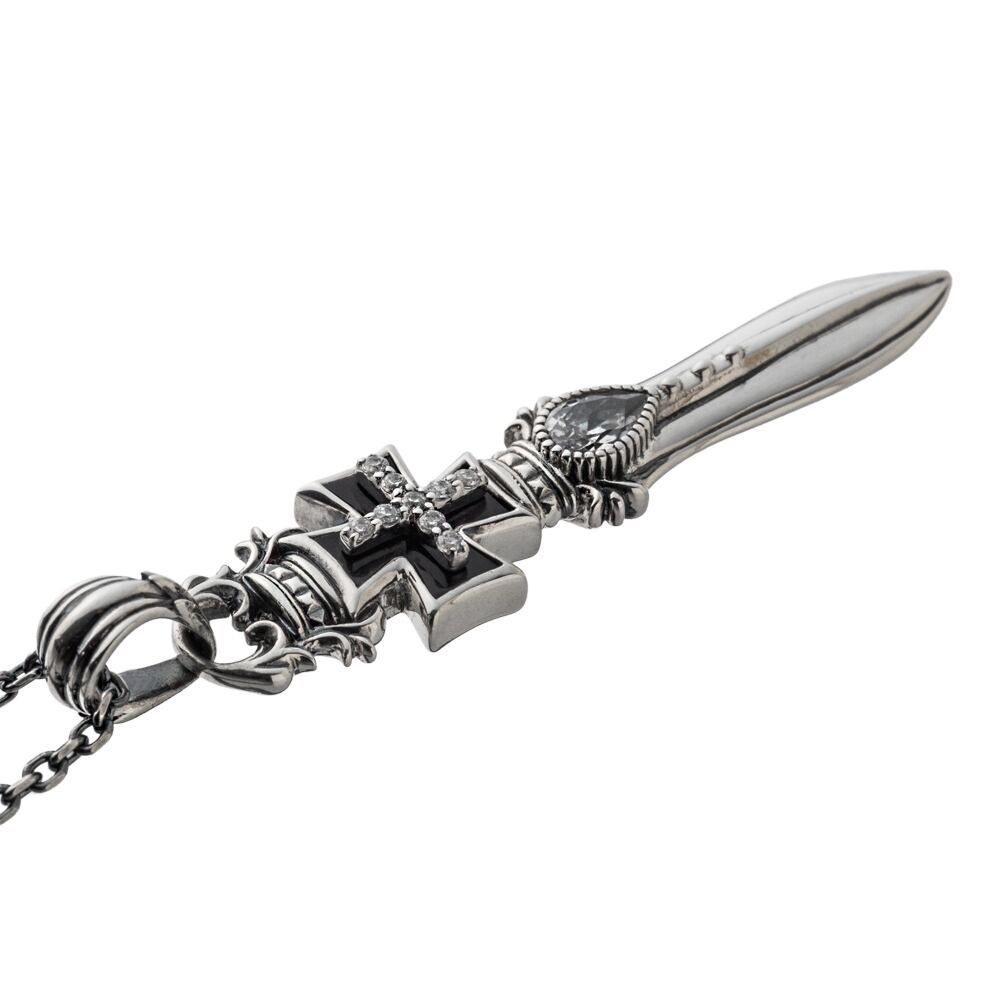 クロスには深い艶を放つシンセティックオニキス(練りブラックサファイア)を敷き、その上にクリアCZをパヴェで精密にセッティング。微細な粒の輝きが星のように瞬き、下部のブレードへ視線を導きます。剣のラインはエッジの角度や溝の抑揚まで計算し、銀の艶に力強い陰影を演出。地金は上質なSV925。裏面にはブランドロゴと〈925〉の品質刻印をさりげなく刻みました。制作は信頼のアトリエで、一点ずつ成形・石留め・磨きを重ね、厚みのバランスから着け心地まで美しく整えています。剣は“勇気”、クロスは“揺るがぬ信念”の象徴。Tシャツにもジャケットにも映える、現代的な小さなオブジェのような一本です。同シリーズのアイテムと重ねれば、コーディネートはさらに完成度を増します。※ペンダントトップのみ(チェーン別売)。