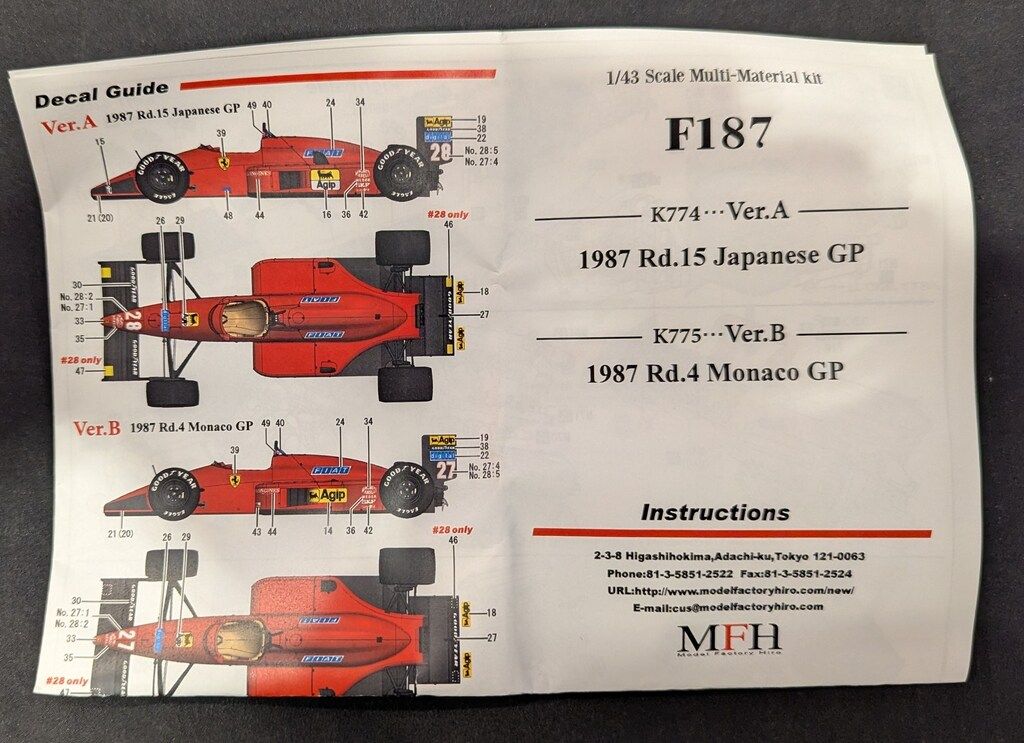MFH モデルファクトリーヒロ 1 43 Scale Multi-material Kit F 187 Ver.A 1987 Rd.15 JapaneseGP 27 28 K-774