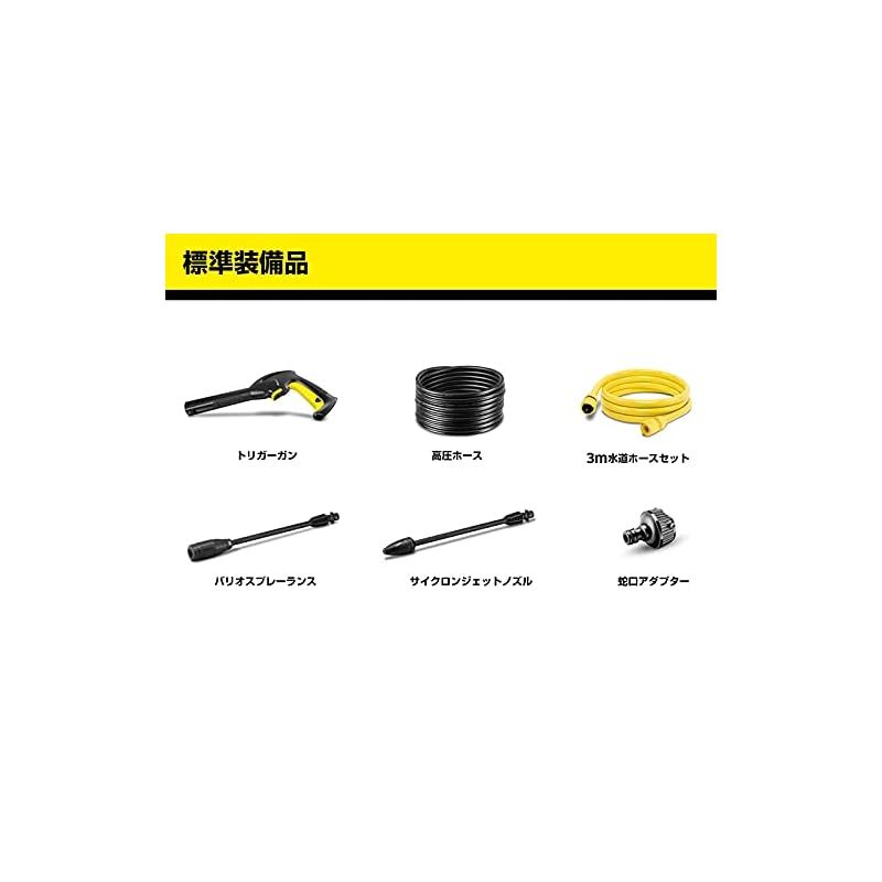 【付属品】トリガーガン、高圧ホース 10m ホースリール、バリオスプレーランス、サイクロンジェットノズル、3m ホースセット、本体側カップリング、取扱説明書【おすすめアタッチメント】洗剤用フォームノズル:2.643-150.0、自吸用給水ホース:2.643-101.0、洗剤(洗浄剤):6.295-743.0。※K1・K2・K3・K4・K5共通。