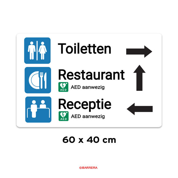 Bewegwijzering bord met pictogrammen en pijlen.